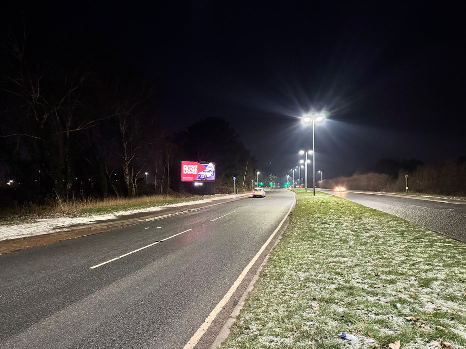 Running parallel to the M62, Liverpool Road (A57) serves as a key arterial route linking the M6 to Manchester’s busy ring road, the M60. Flowing directly through the areas of Irlam and Cadishead, this corridor captures significant commuter traffic travelling into Manchester city centre each day, as well as outbound traffic returning to surrounding residential areas. The site features a prominent Double D48 digital screen configuration, positioned to maximise visibility along the busy dual carriageway. The screens are angled towards traffic travelling in both directions and elevated above street level, ensuring clear sightlines and extended dwell time for passing motorists.